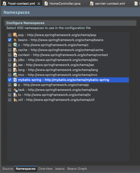 이렇게 Namespaces에서 mybatis-spring을 활성화 시키고, Source로 돌아와서 다음 코드를 추가하자.