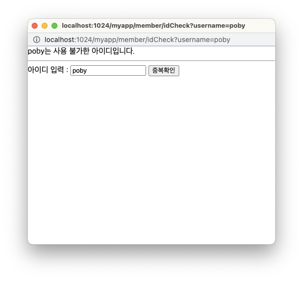 parameter로 넘어온 username을 입력칸에 넣어주고 form태그로 DB에 값을 넘겨주어 DB에 중복되는 아이디가 있는지 확인하자.