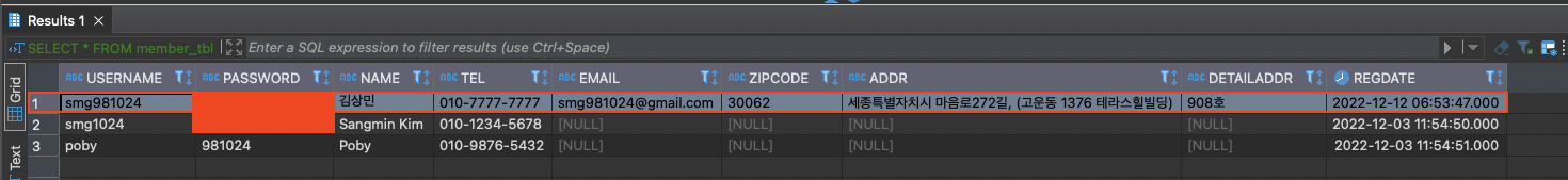 INSERT INTO member_tbl(username, password, name, tel, email, zipcode, addr, detailaddr)
