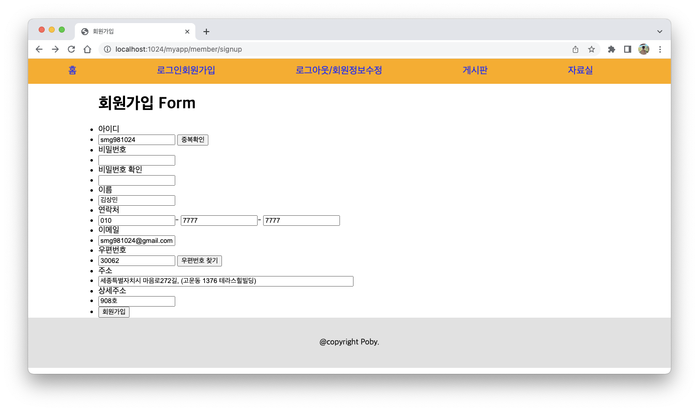 실패했을때 다시 회원가입 페이지로 뒤로가기해줄 signupResult.jsp를 만들어주고 실행해보자.