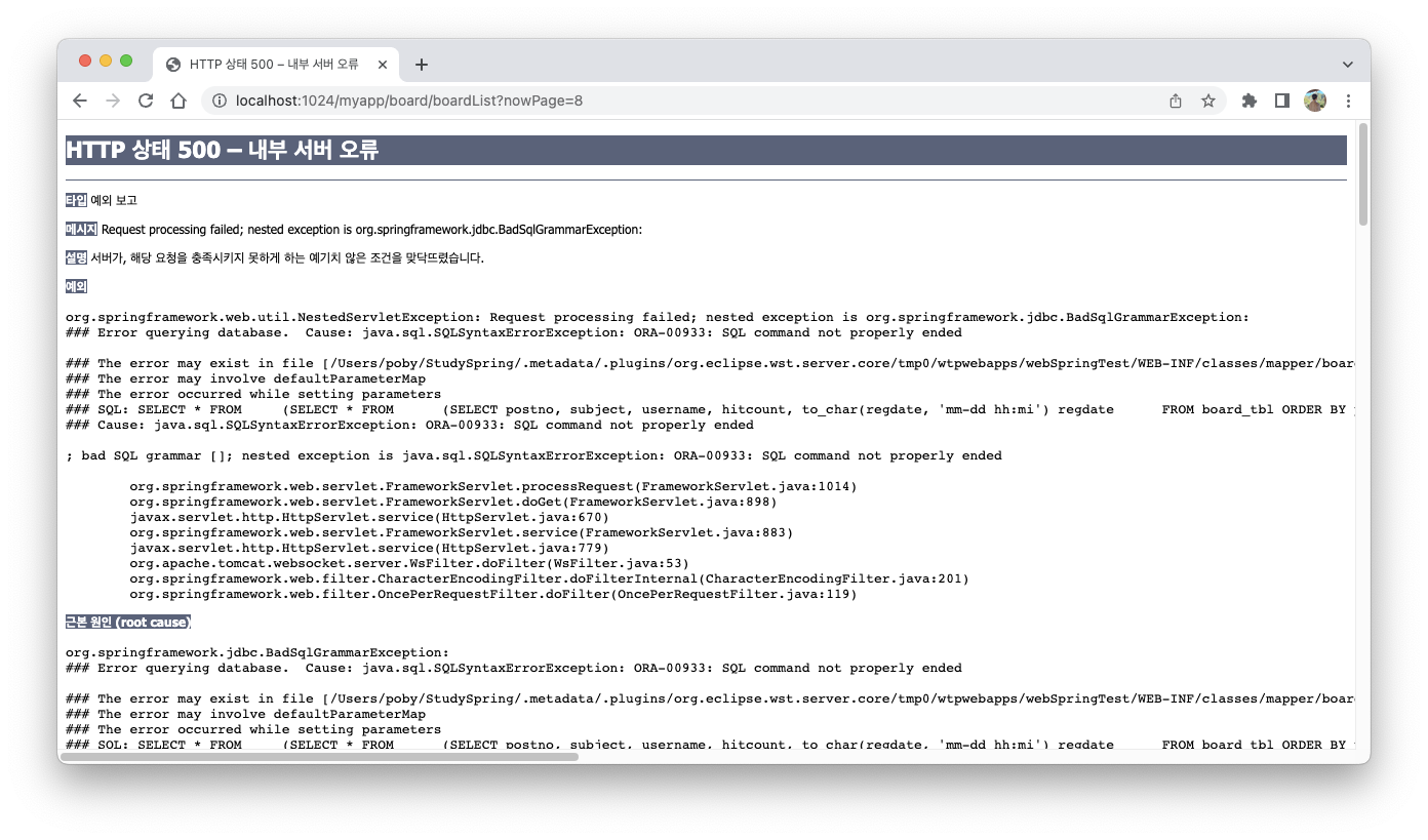 위 sql문으로 실행했을때, CDATA의 잘못된 사용으로 sql문법에 예외가 발생했다.