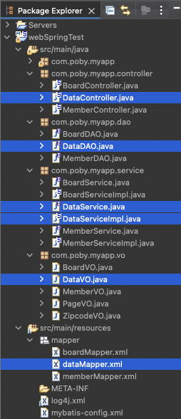 views폴더 아래에 data폴더를 생성하고, 컨트롤러, DAO, VO, Service, ServiceImpl, Mapper를 알맞은 패키지 아래에 생성하자.