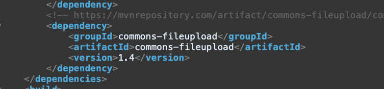 파일업로드를 하려면 새로운 라이브러리(dependency)가 필요하다. commons-fileupload라는 maven dependency를 pom.xml에 추가하고 불러오자.