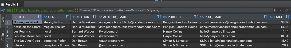 b.title, b.genre, a.author, a.author_email, p.publisher, p.pub_email, b.price