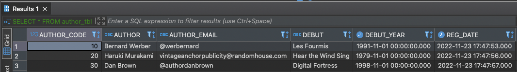VALUES (auth_seq.nextval, 'Dan Brown', '@authordanbrown', 'Digital Fortress', TO_DATE('1998','yyyy'), SYSDATE);