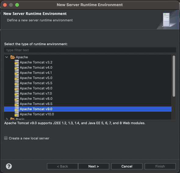 Finish를 눌러 이 프로젝트가 사용할 서버를 정하자. 이후로는 변경사항 없이 쭉 끝까지 진행하면 된다.