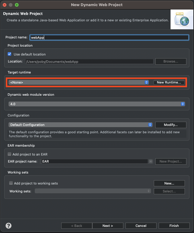여기서 Target runtime을 아까 설치한 tomcat으로 설정해주어야 한다.