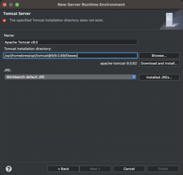 이렇게 tomcat이 설치된 경로를 설정해달라고 하는데, 우리는 /opt/homebrew/opt/tomcat@9/9.0.69/libexec 를 찾아서 고르자.
