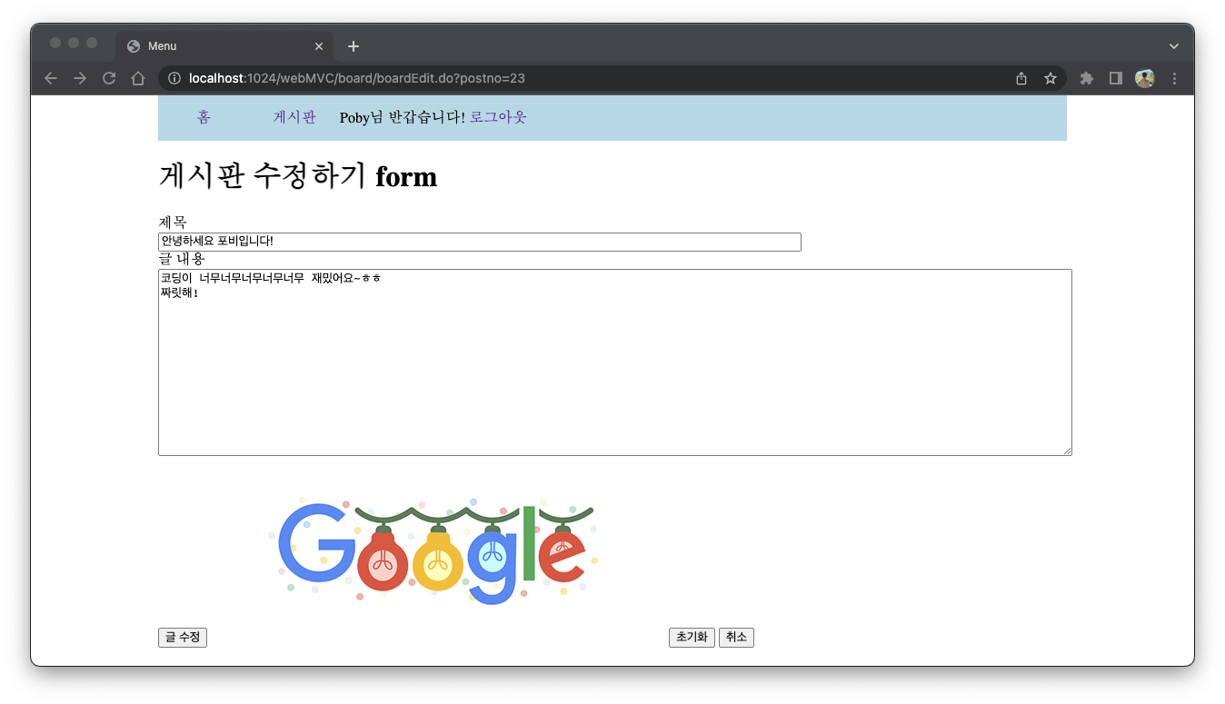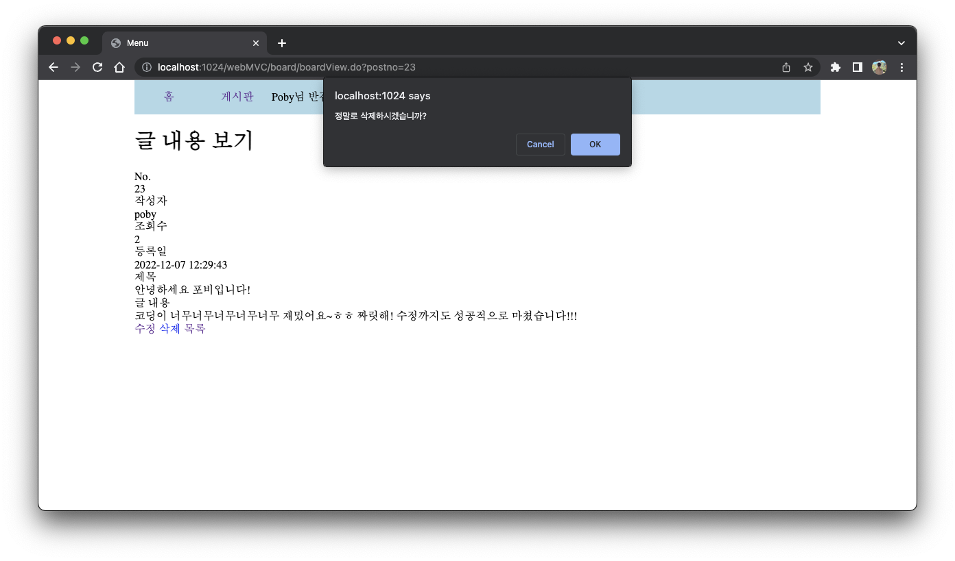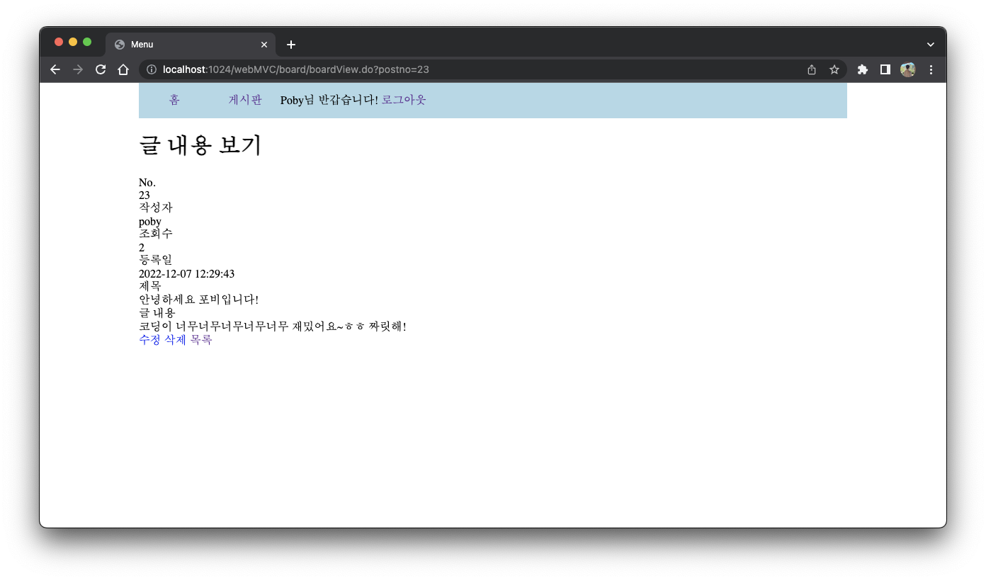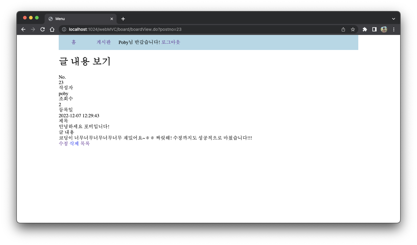 글 작성과 거의 동일하다. 대신 목록으로 보내주기보단, 수정결과를 바로 확인할 수 있게 글 내용보기로 보내준다. 물론 고유번호 postno도 parameter로 같이 보낸다.