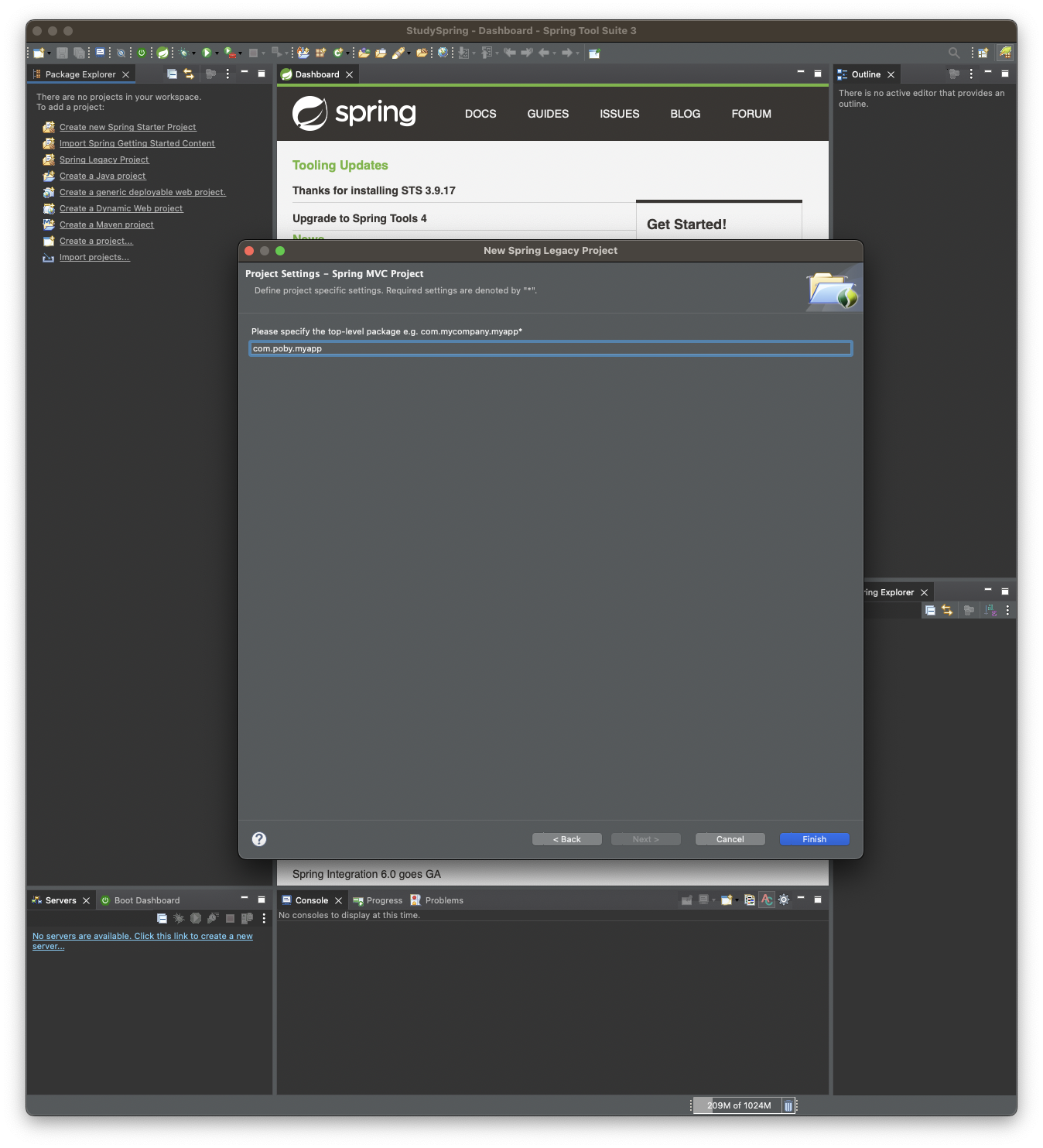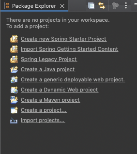 맨 처음 실행하면 왼쪽 Package Explorer에서 Spring Legacy Project를 새로 생성할 수 있다.