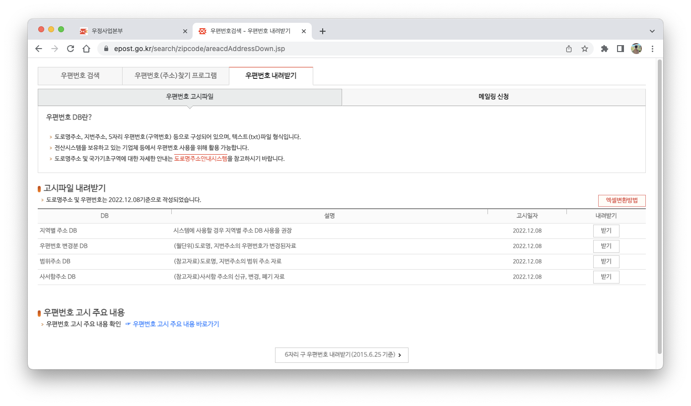 우정사업본부 홈페이지에서 우편번호 찾기를 누른 다음, 우편번호 내려받기에 가면 우리나라 지역별 주소 DB를 받을 수 있다.